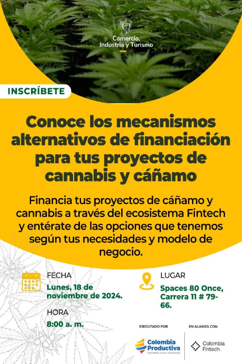 Bogotá D.C., 12 de noviembre de 2024.- El próximo lunes 18 de noviembre de 2024, el Ministerio de Comercio, Industria y Turismo, a través de Colombia Productiva y en alianza con Colombia Fintech, ofrecerá la primera de dos sesiones informativas llamadas “Conoce los mecanismos alternativos de financiación para tus proyectos de cannabis y cáñamo”.