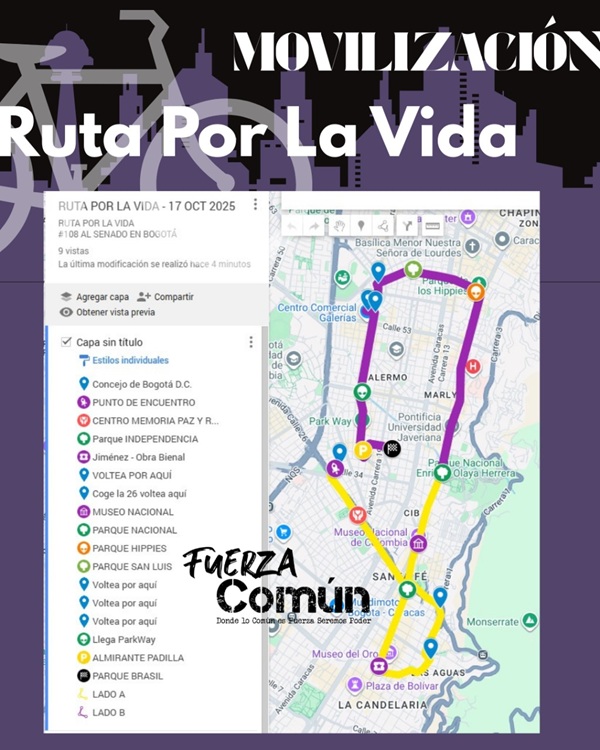 La movilización, que busca visibilizar el derecho a la ciudad y a la movilidad sostenible, está organizada por el movimiento Fuerza Común. La convocatoria oficial es «La Ruta por la Vida #108 con Beto al Senado», en alusión a la candidatura de Carlos Alberto Benavides. La concejal Donka Atanassova, del Pacto Histórico, también invita al evento.