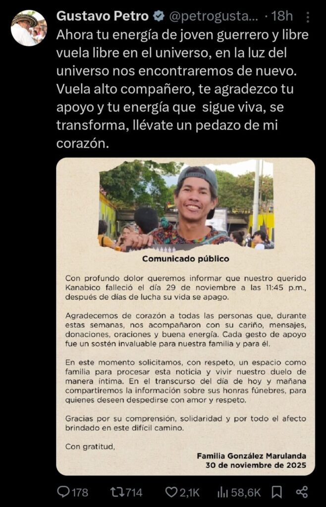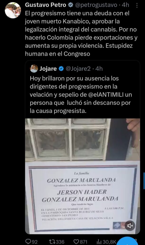 Al pronunciamiento de Mininterior se suma la reacción del mandatario colombiano, Gustavo Petro, que este lunes primero de diciembre, a través de su cuenta en X, manifestó “el progresismo tiene una deuda con el joven muerto Kanabico: aprobar la legalización integral del cannabis. Por no hacerlo Colombia pierde exportaciones y aumenta su propia violencia. Estupidez humana en el Congreso.”