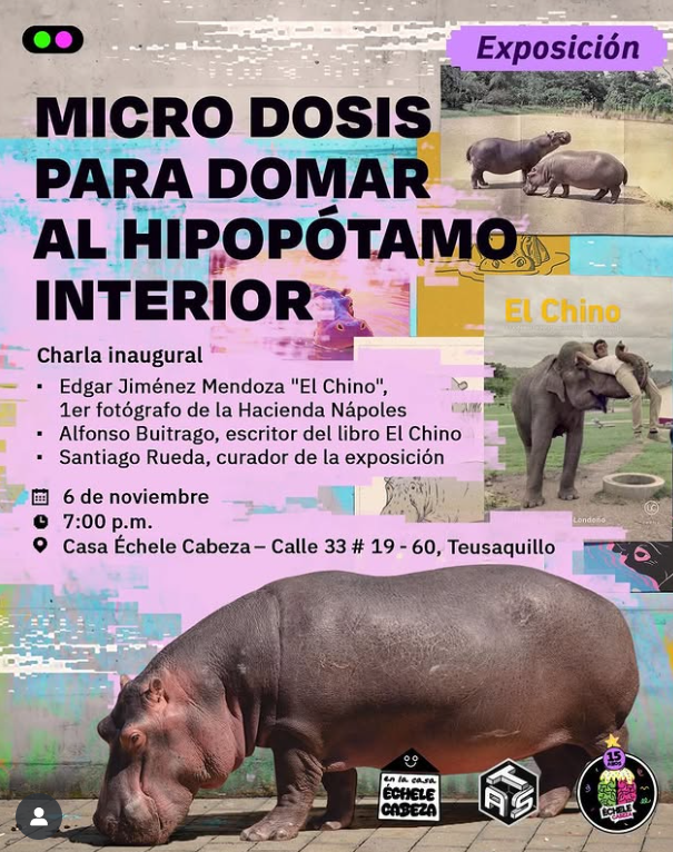 Bogotá D.C., 5 de noviembre de 2025.- La Casa Échele Cabeza, ubicada en el barrio Teusaquillo, abre sus puertas del 6 de noviembre al 4 de diciembre para albergar la exposición «Microdosis para domar el hipopótamo interior». El evento, organizado por la Corporación Acción Técnica Social, y con curaduría de Santiago Rueda, reúne obras de 20 artistas contemporáneos que abordan, desde distintas estéticas, el simbolismo del hipopótamo de la Hacienda Nápoles.