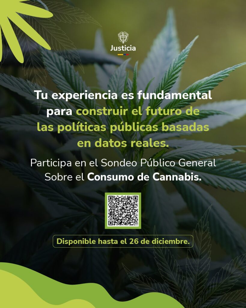 Bogotá D.C., 5 de diciembre de 2025.- El Ministerio de Justicia y del Derecho, MinJusticia, lanzó un Sondeo Público General, con el objetivo de caracterizar el consumo colectivo de cannabis de dosis mínima en Colombia. El formulario estará habilitado hasta el próximo 26 de diciembre.