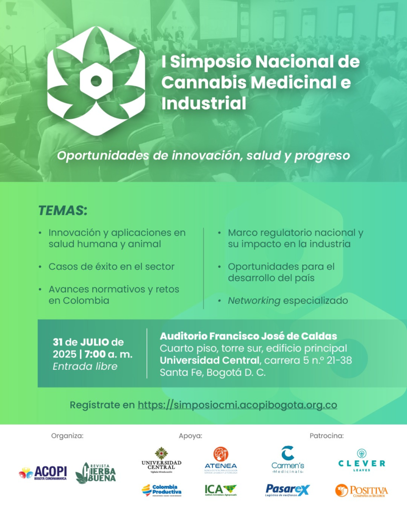 Bogotá D.C., 18 de julio de 2025.- El próximo jueves 31 de julio, desde las 7:00 a. m., el Auditorio Francisco José de Caldas, cuarto piso, torre sur, edificio principal Universidad Central, carrera 5 # 21-38, será escenario del I Simposio Nacional de Cannabis Medicinal e Industrial, una jornada académica y empresarial organizada por ACOPI Bogotá-Cundinamarca, en alianza con Hierbabuena Revista y gracias a el respaldo de aliados institucionales, gremiales y académicos comprometidos con el desarrollo sostenible y la innovación en Colombia.