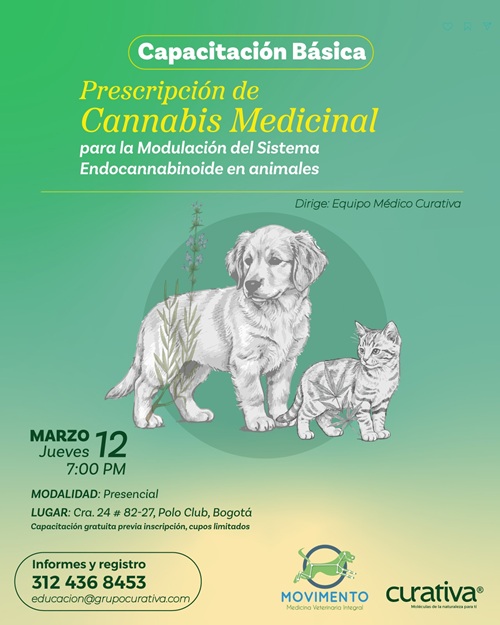 El 12 de marzo, Grupo Curativa y MOVIMENTO, ofrecen una capacitación gratuita sobre prescripción de cannabis para la modulación del sistema endocannabinoide en animales, con cupos limitados y enfoque en medicina integral.