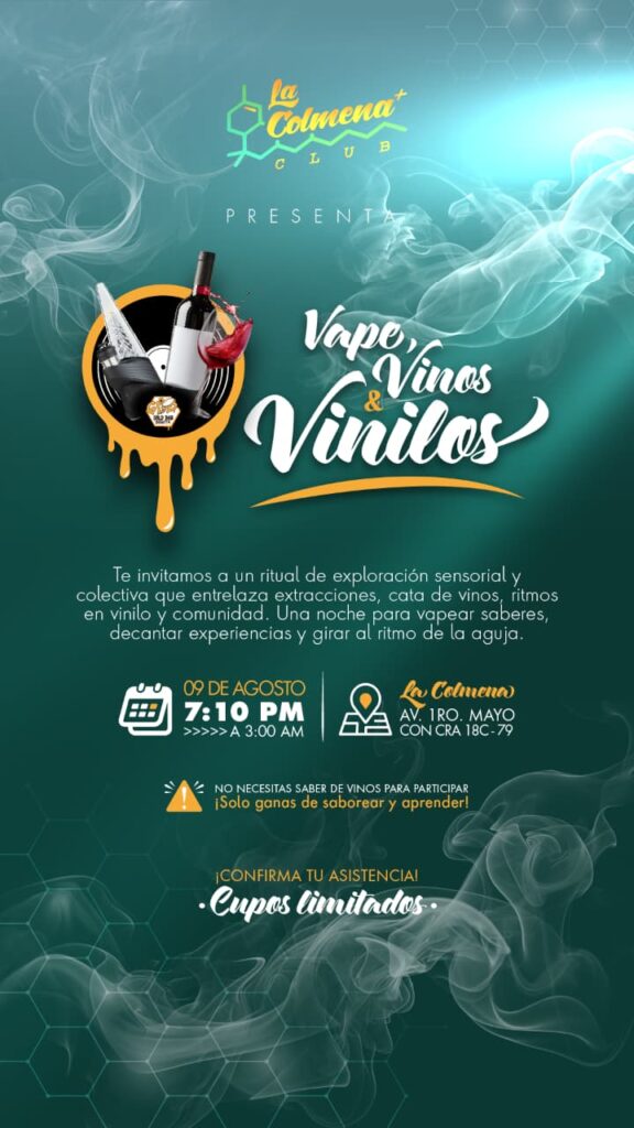 Bogotá D.C., 8 de agosto de 2025.- La Colmena Club presenta este sábado una propuesta única que fusiona cultura, conocimiento y placer sensorial con «Vape, Vinos y Vinilos», una celebración de los sentidos, el saber y la autonomía colectiva. El evento, que se desarrollará desde las 7:10 p.m. hasta las 3:00 a.m., explora el vino, la flor cannábica y el sonido como rituales de cuidado, goce y conciencia.